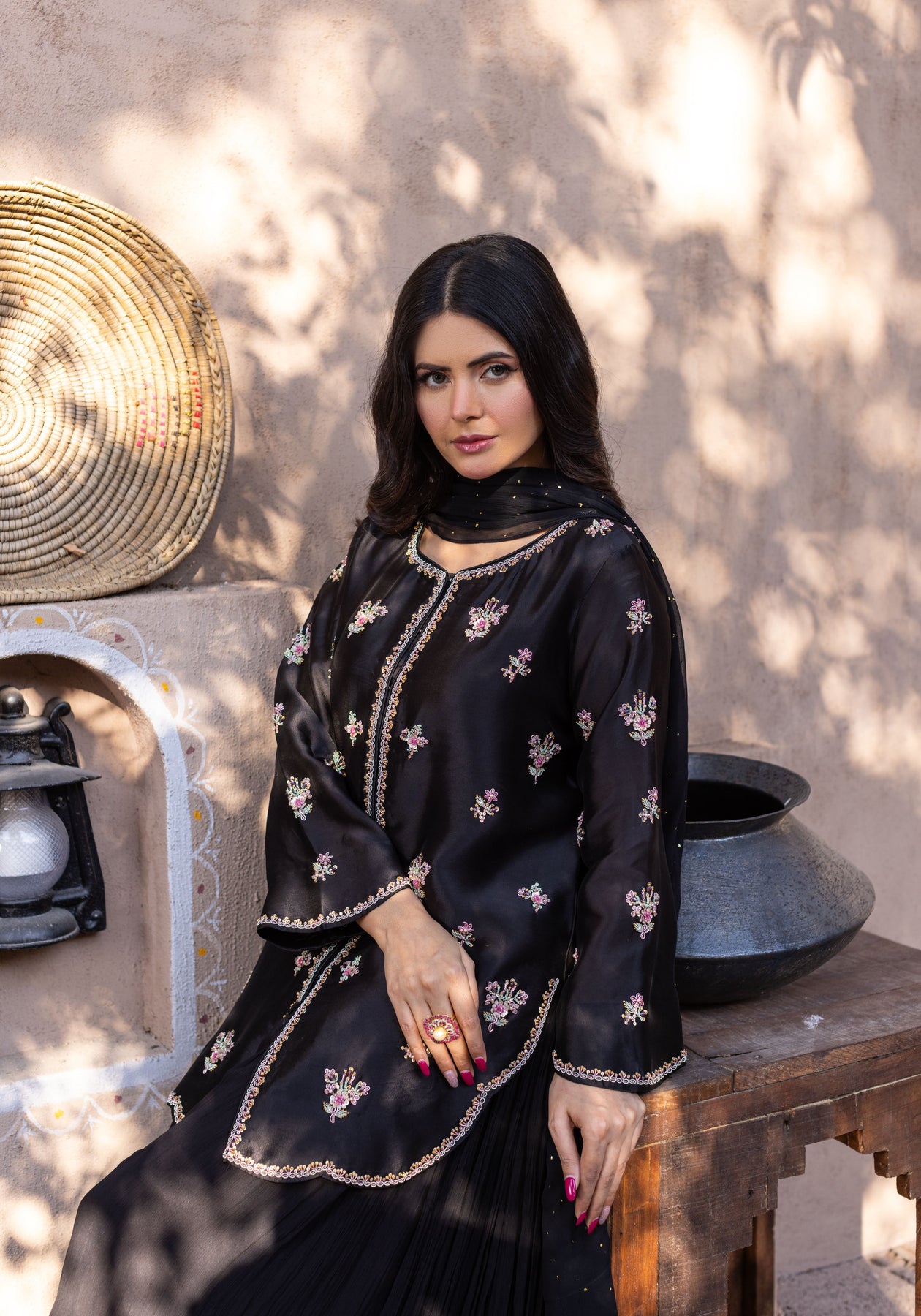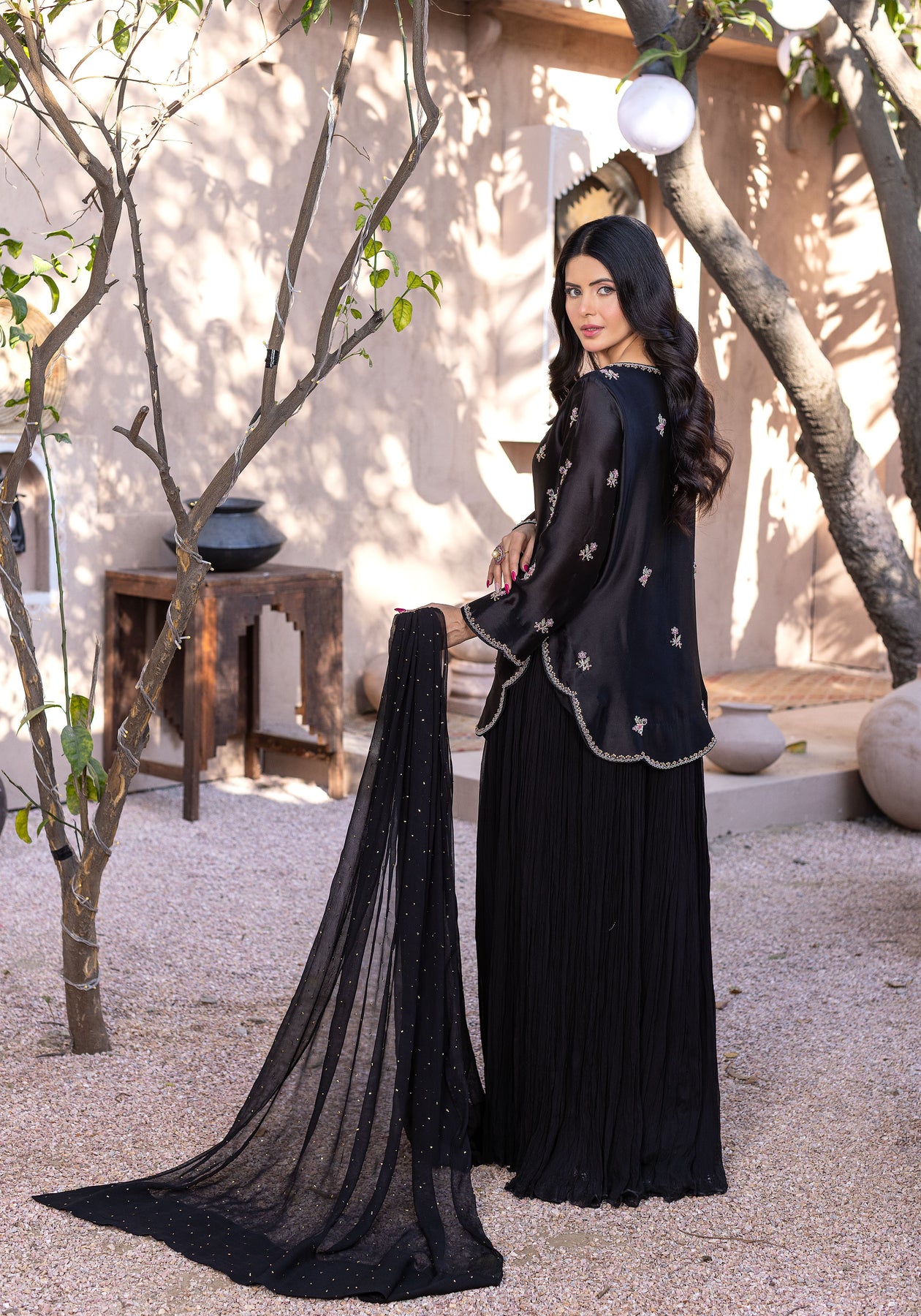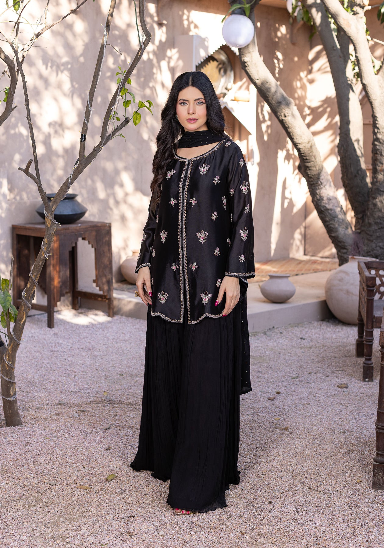 A refined short jacket silhouette showcasing multi-tone floral embellishments, delicately handcrafted using dabkha, beads, and sequins. Designed for those who appreciate statement handwork without heavy embroidery or lace details. Can be paired with a flared sharara for drama or a skinny shalwar for a modern festive vibe.