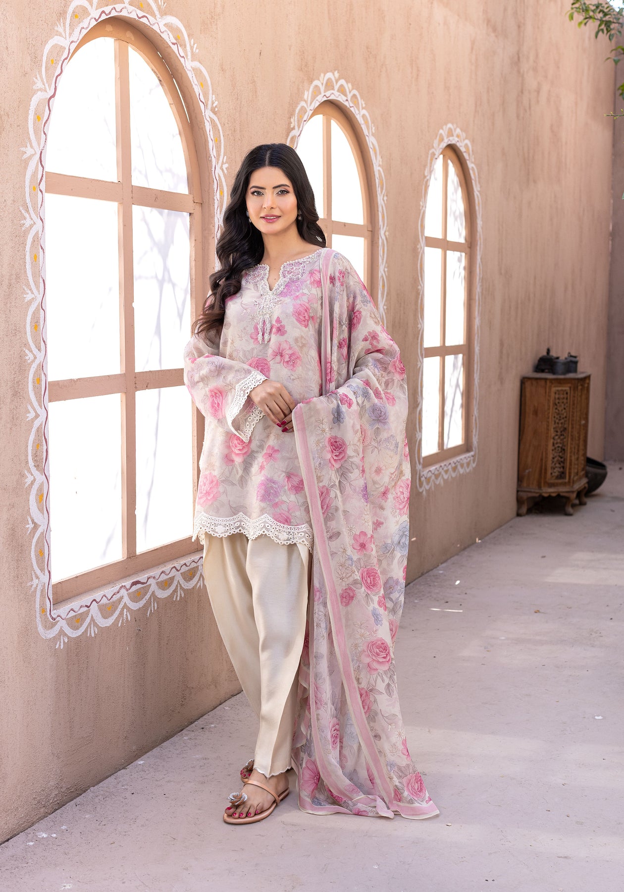 A dreamy pastel ensemble featuring a delicate handcrafted neckline on a multi hued floral print. Designed with a relaxed straight-cut silhouette, full sleeves, and a flowing chiffon dupatta adorned with subtle scalloped lace edging. Perfect for daytime gatherings, Eid festivities, and summer. Paired best with ivory trousers and nude sandals for an effortlessly graceful look.