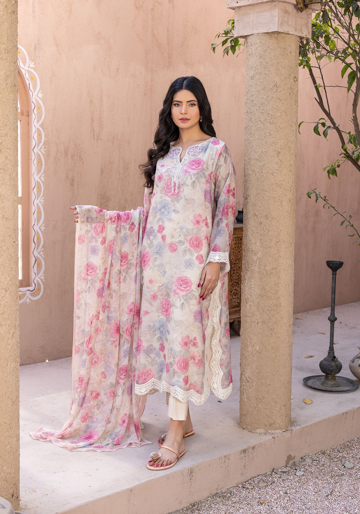 A dreamy pastel ensemble featuring a delicate handcrafted neckline on a multi hued  floral print. Designed with a relaxed straight-cut silhouette, full sleeves, and a flowing chiffon dupatta adorned with subtle scalloped lace edging. Perfect for daytime gatherings, Eid festivities, and summer. Paired best with a matching skinny trouser and nude sandals for an effortlessly graceful look.