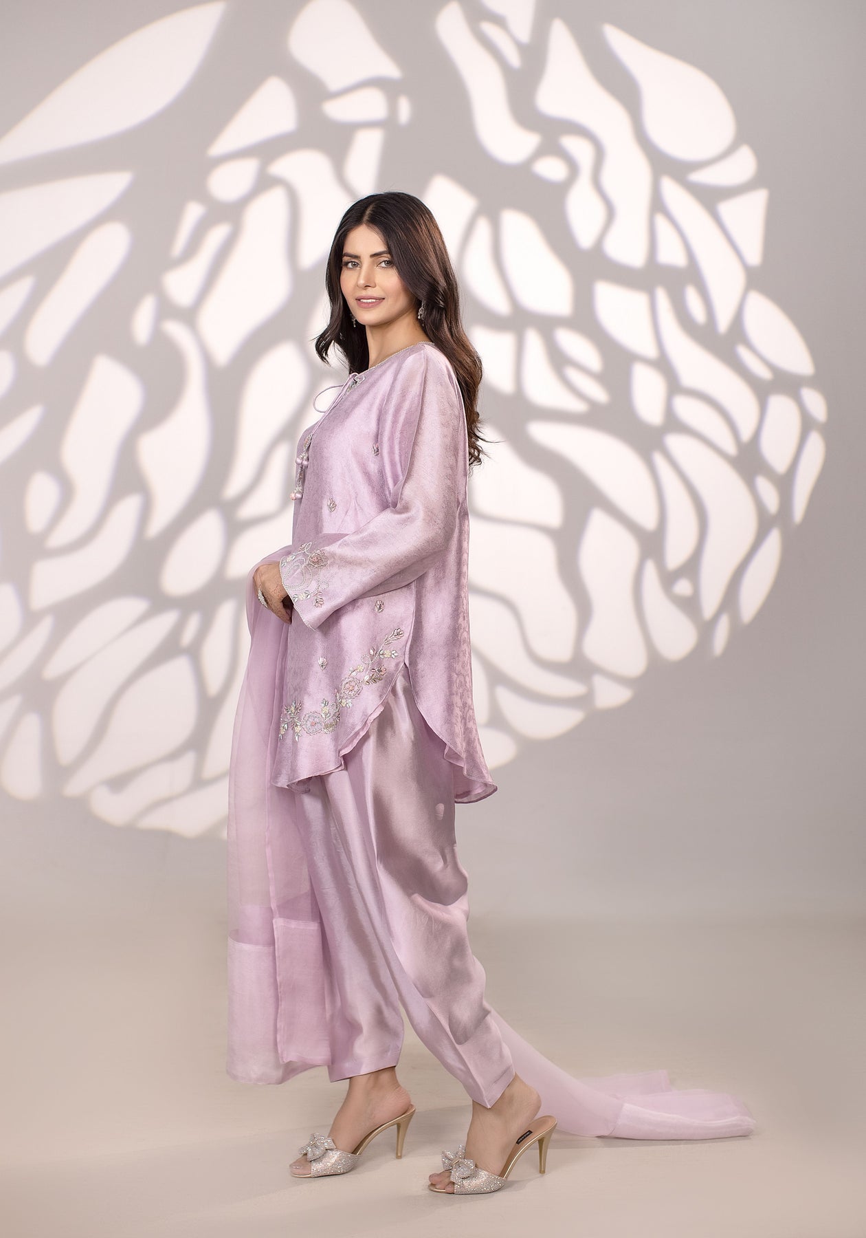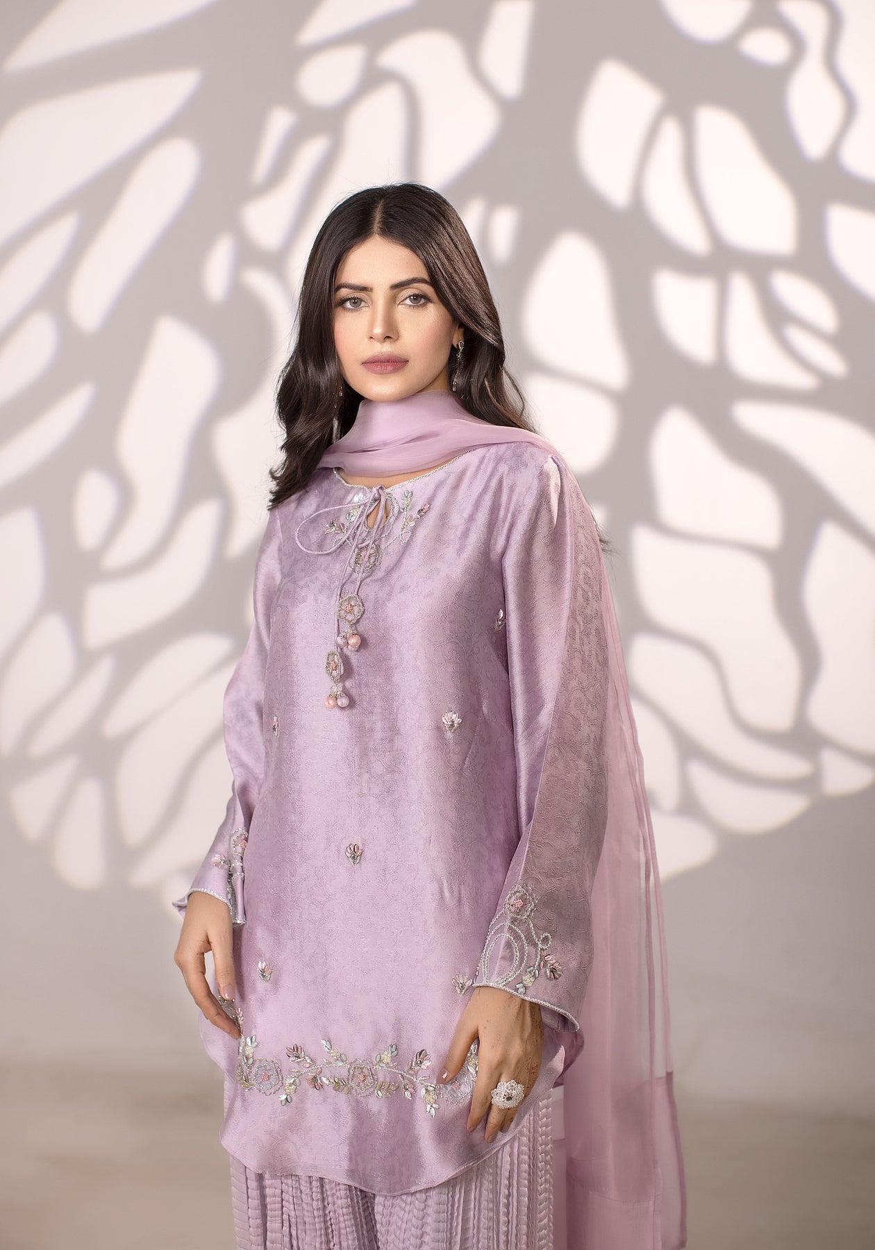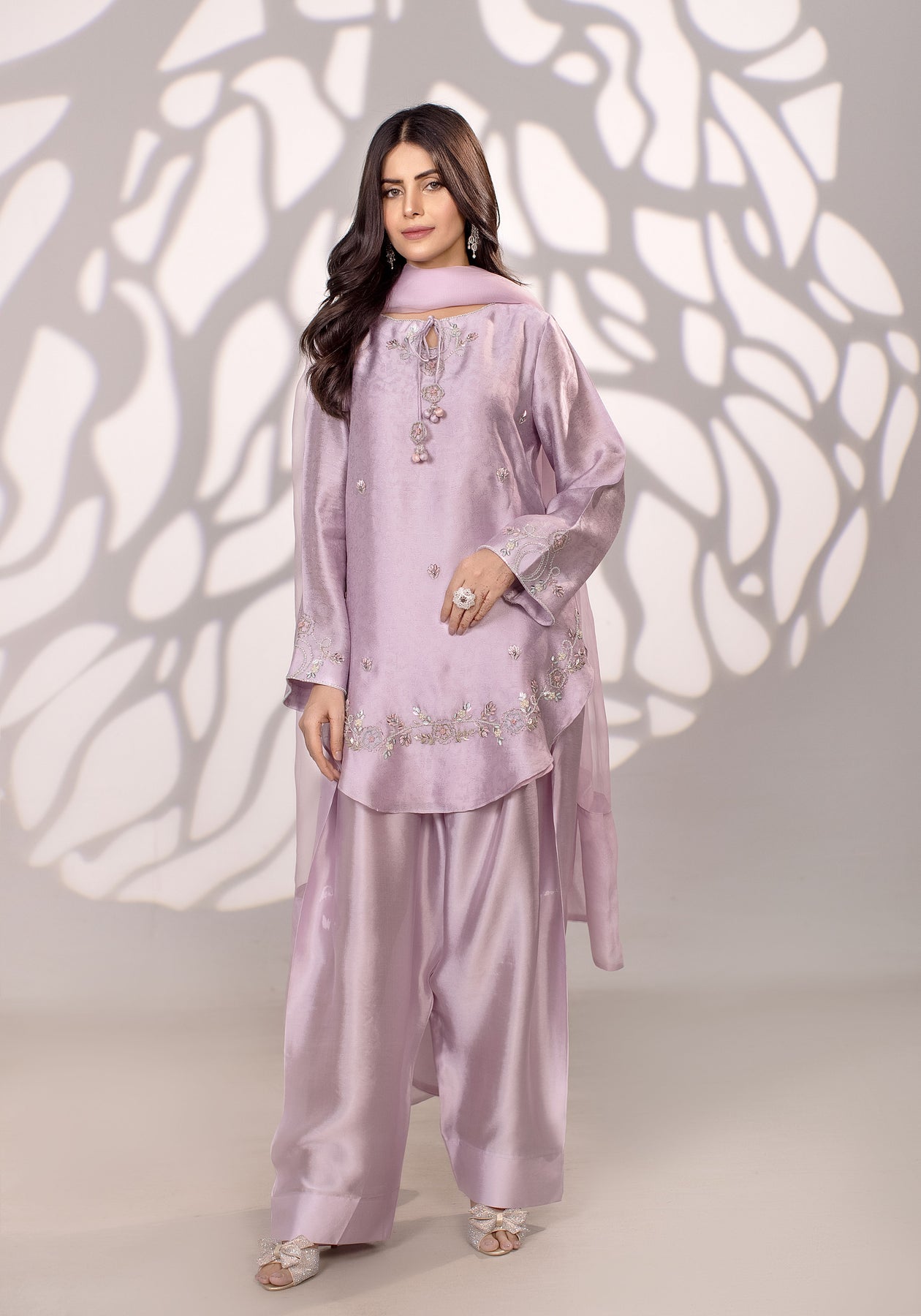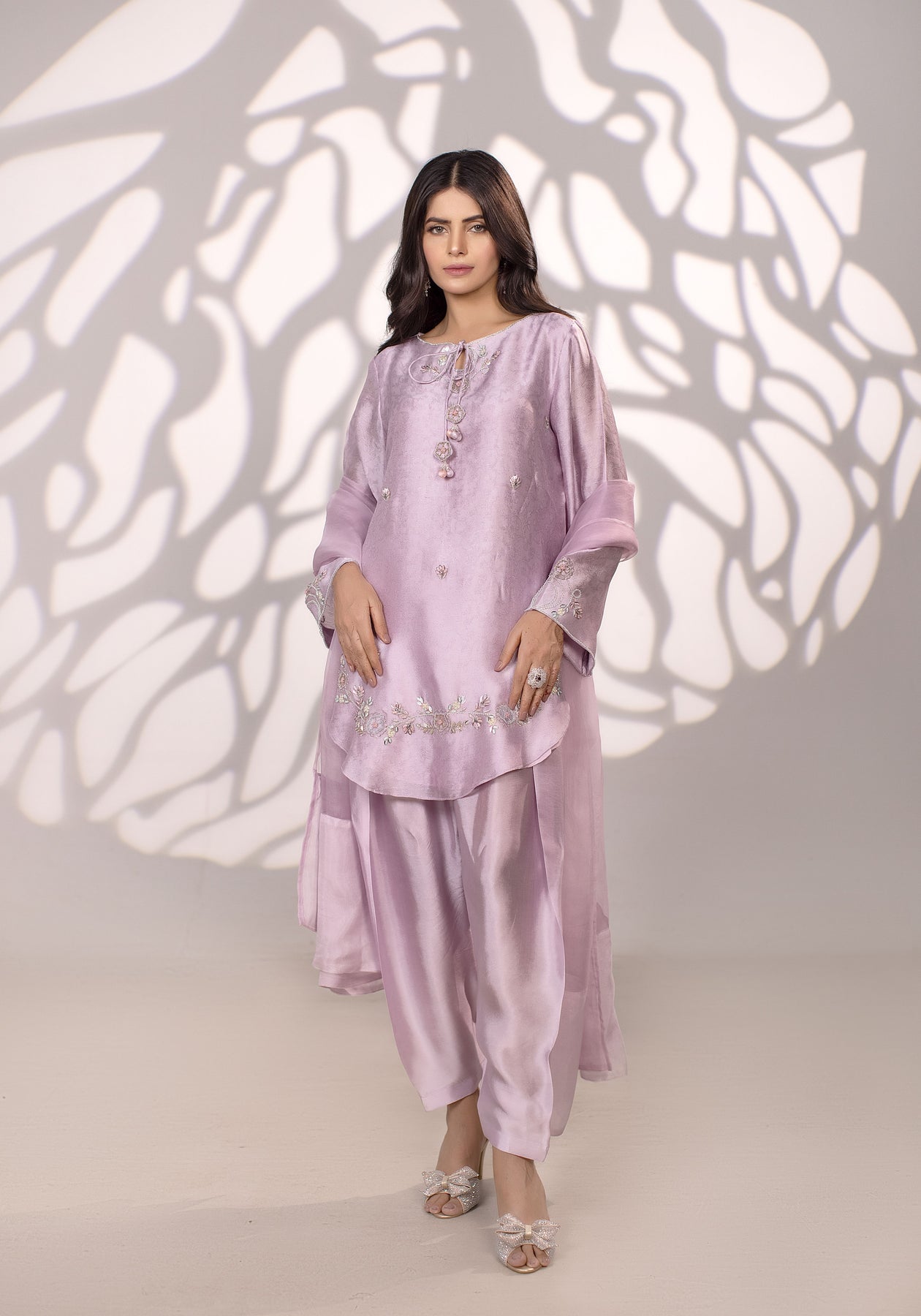 Exquisite elegance personified, this Jazmin ensemble is meticulously crafted on luxurious pure tissue silk. The pièce de résistance has a breathtakingly beautifully handcrafted keyhole  neckline, that’s lavishly adorned with crystals and beads. Each crystal is carefully embellished by skilled artisans, adding a touch of human love to every stitch. The back is equally stunning, boasting the same intricate detailing that exudes sophistication. Paired with a delicate organza dupatta and a tissue silk farshi/ skinny shalwar or crushed silk Sharara , this 3-piece masterpiece embodies refined grace and captivating charm, making it an ideal choice for the festive season."