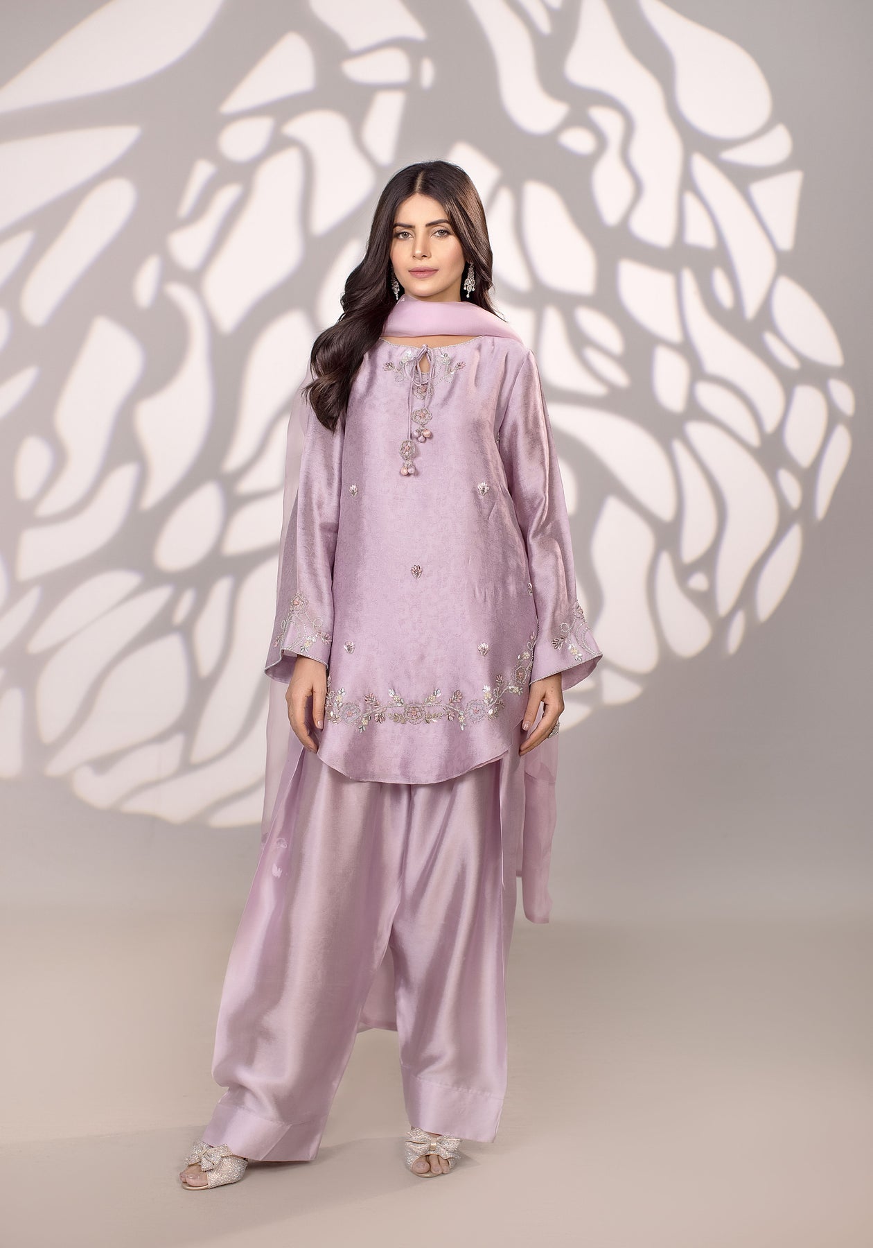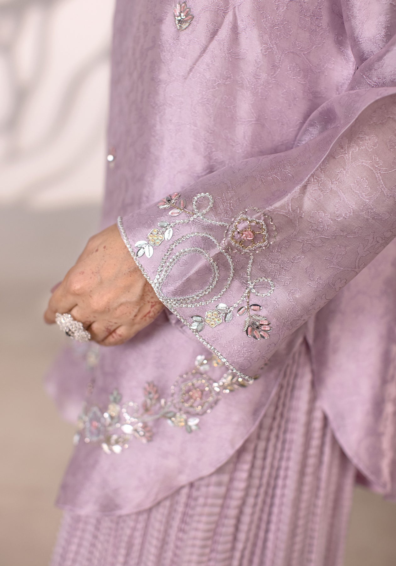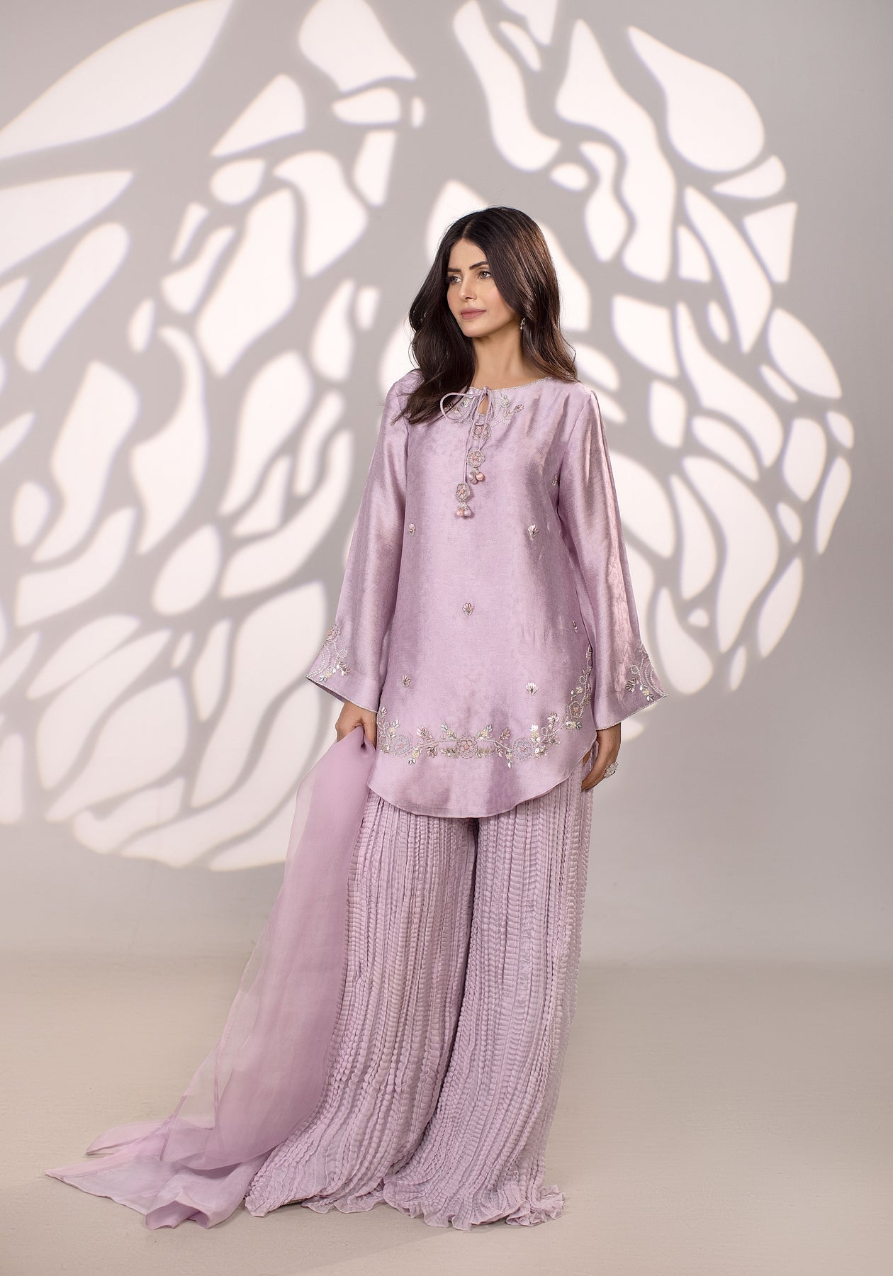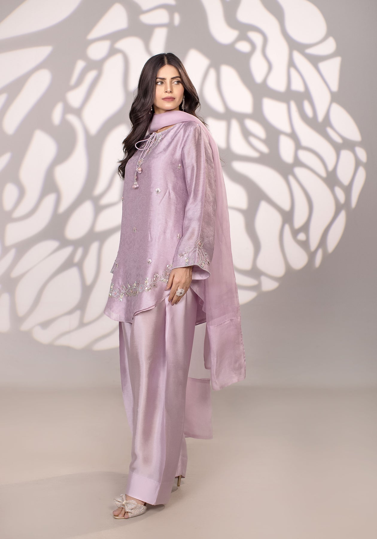 Exquisite elegance personified, this Jazmin ensemble is meticulously crafted on luxurious pure tissue silk. The pièce de résistance has a breathtakingly beautifully handcrafted keyhole  neckline, that’s lavishly adorned with crystals and beads. Each crystal is carefully embellished by skilled artisans, adding a touch of human love to every stitch. The back is equally stunning, boasting the same intricate detailing that exudes sophistication. Paired with a delicate organza dupatta and a tissue silk farshi/ skinny shalwar or crushed silk Sharara , this 3-piece masterpiece embodies refined grace and captivating charm, making it an ideal choice for the festive season."