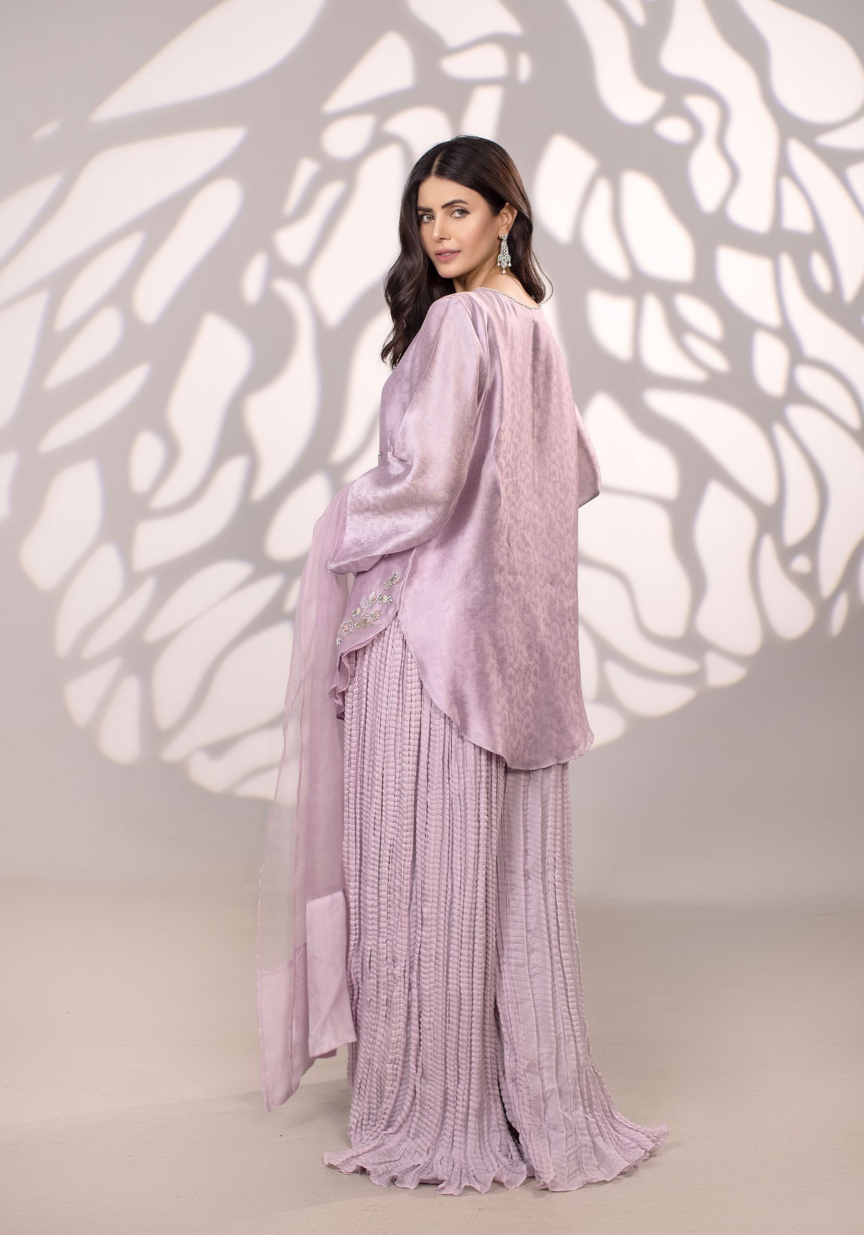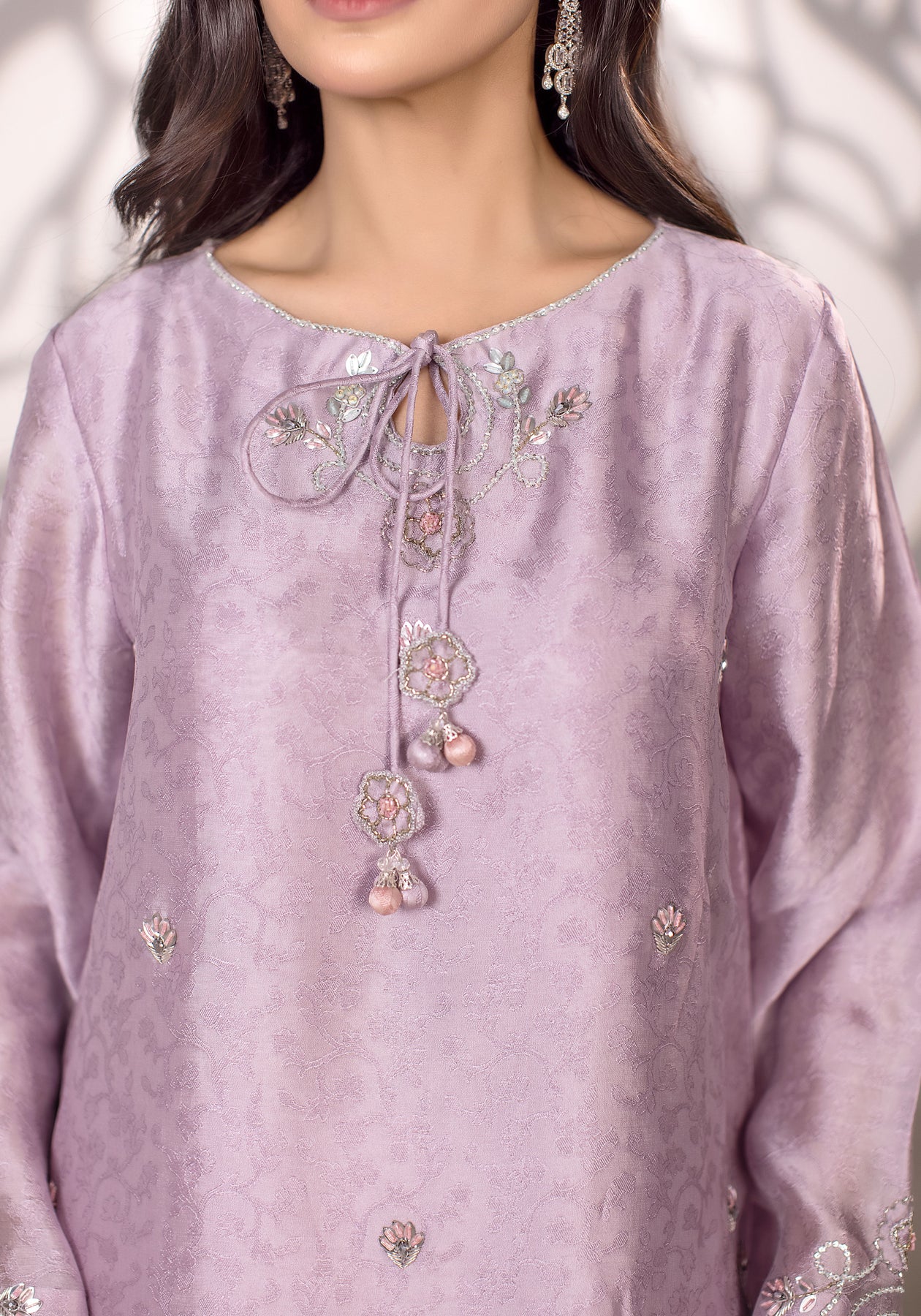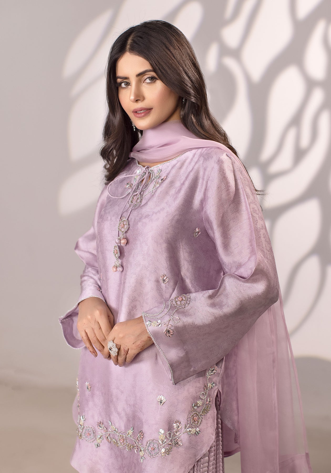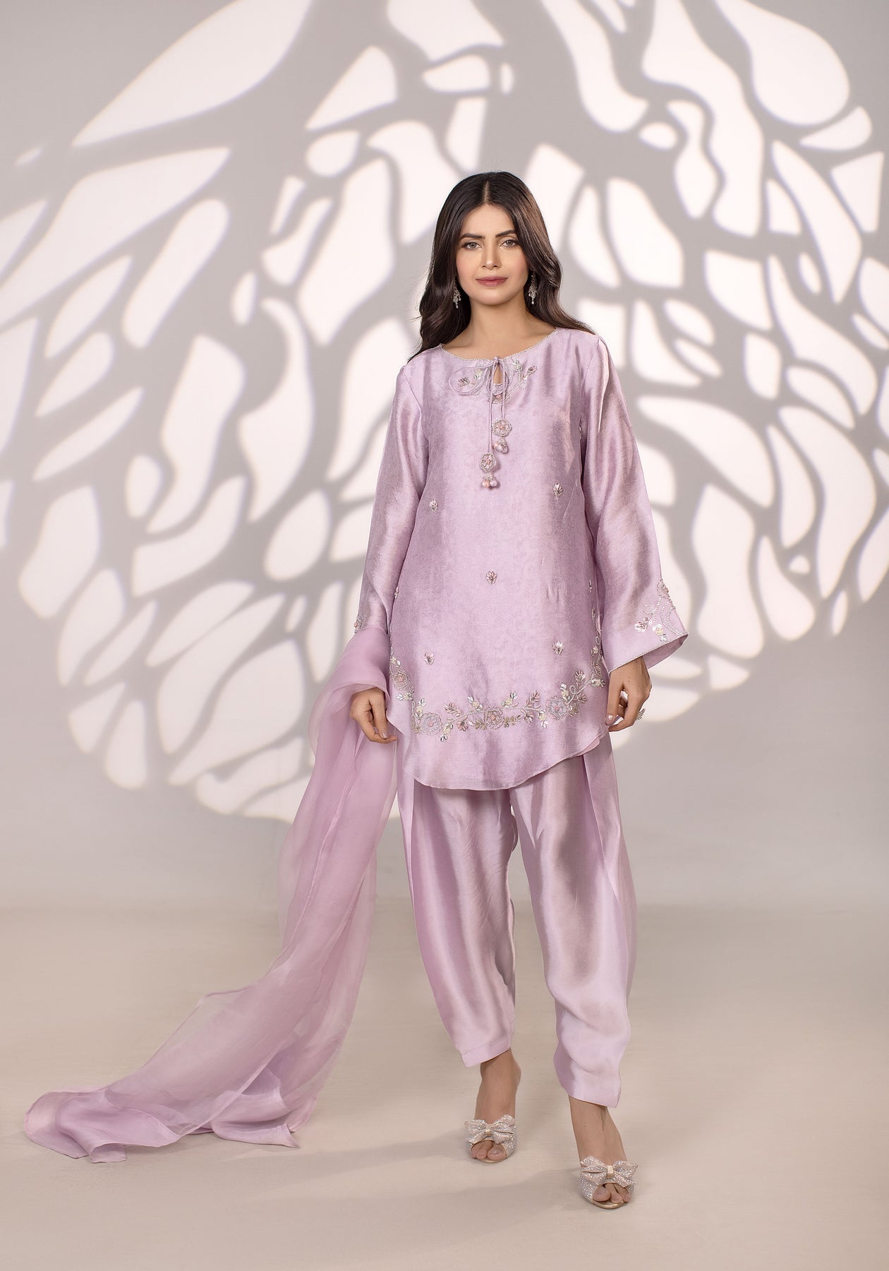 Exquisite elegance personified, this Jazmin ensemble is meticulously crafted on luxurious pure tissue silk. The pièce de résistance has a breathtakingly beautifully handcrafted keyhole  neckline, that’s lavishly adorned with crystals and beads. Each crystal is carefully embellished by skilled artisans, adding a touch of human love to every stitch. The back is equally stunning, boasting the same intricate detailing that exudes sophistication. Paired with a delicate organza dupatta and a tissue silk farshi/ skinny shalwar or crushed silk Sharara , this 3-piece masterpiece embodies refined grace and captivating charm, making it an ideal choice for the festive season."